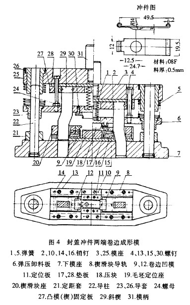 (3)由于卷邊坯件是經(jīng)預(yù)彎的,裝在楔滑塊頭部的卷邊凹模由楔推動(dòng)進(jìn)行推卷成形。卷邊變形過(guò)程及凹 模工作部分的設(shè)計(jì)見(jiàn)圖5。