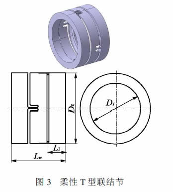 如圖3所示的柔性T型聯(lián)結(jié)節(jié)是一種新型的柔性連接與傳動(dòng)結(jié)構(gòu), 其主要利用柔性鉸鏈實(shí)現(xiàn)承擔(dān)軸向拉壓的同時(shí)吸收彎曲和扭轉(zhuǎn)。此處的柔 性鉸鏈可以采用倒圓角直梁型、橢圓直梁復(fù)合型、拋物線直梁復(fù)合型及雙曲線直梁復(fù)合型柔性鉸鏈, 我們分別將以上4種復(fù)合型柔性鉸鏈應(yīng)用于該柔性T型聯(lián)結(jié)節(jié)結(jié)構(gòu)中, 并對(duì)其剛度性能進(jìn)行研究。 取柔性T型聯(lián)結(jié)節(jié)的主要結(jié)構(gòu)尺寸為: 外徑Do= 112mm, 內(nèi)徑Di= 82mm, 總長(zhǎng)Lw = 216mm, 決定中間 環(huán)位置的參數(shù)L3= 50mm; 為保持可比性, 使四種復(fù)合型柔性鉸鏈的主要結(jié)構(gòu)參數(shù)分別相同, 即直梁部分長(zhǎng)度L2= 50mm, 總長(zhǎng)度LH= 70mm, 寬度b= 5mm, 最小厚度t= 6mm。