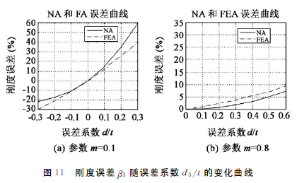 鉸鏈參數(shù)m 對剛度誤差β3也不敏感,但誤差參數(shù)d3/t的影響較大,如圖11所示,取m=0.1,當(dāng)d3/t=0.3時,NA 的誤差是59.11%,FEA 的誤差是41.44%;當(dāng)d3/t= -0.3 時,NA 的誤差是-21.53%,FEA的誤差是-27.63%。同時注意到,在數(shù)值計算時,假設(shè)圖6所示鉸鏈截面兩端的轉(zhuǎn)角是一致的,而實際上當(dāng)施加一定載荷時,截面兩端的轉(zhuǎn)角并不一致而具有一定的扭轉(zhuǎn),這也造成了NA 和FEA計算結(jié)果的偏差。
