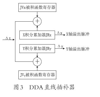 如圖3所示[7,8],一個(gè)直線插補(bǔ)器由兩個(gè)數(shù)字積分器組成,每個(gè)積分器又包括一個(gè)被積函數(shù)寄存器和一個(gè)累加器。終點(diǎn)的坐標(biāo)值存放在被積函數(shù)寄存器里,每給出一個(gè)插補(bǔ)脈沖各自的累加器就累加一次,當(dāng)累加的值大于累加器的容量則溢出,同時(shí)控制器發(fā)出控制指令驅(qū)動(dòng)相應(yīng)的軸移動(dòng)一個(gè)脈沖當(dāng)量[9]。