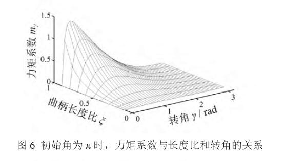 由式(9),圖6 為初始角β=π 時,mγ 與曲柄長度比ξ和轉(zhuǎn)角γ 的關(guān)系,ξ∈[0.1, 0.9],γ∈[0, π]。圖7為ξ=0.2 時,不同β 下,mγ 與轉(zhuǎn)角γ 的關(guān)系。圖8 為β=π 時,不同ξ 下,mγ 與轉(zhuǎn)角γ 的關(guān)系。