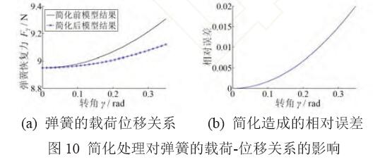 評估式(13)的簡化處理所造成的誤差。根據(jù)零剛度柔性鉸鏈實際加工參數(shù)(第4.2 節(jié)):n=3,l=40 mm,β=π,ξ=0.2,E=73 GPa;內(nèi)外環(huán)柔性鉸鏈簧片尺寸L=46 mm,T=0.3mm,W=9.4mm;對比式 (12)、(14),簡化前后彈簧的載荷位移關(guān)系和相對誤 差分別如圖10a、10b所示。