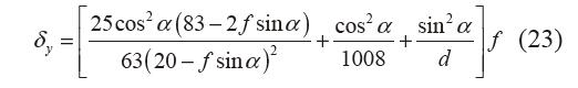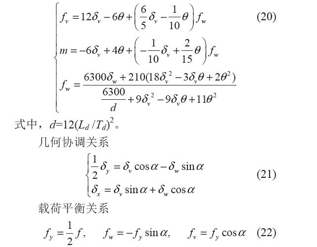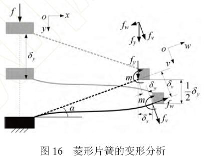 由菱形片簧的對稱性,只需對一根簧片進(jìn)行受 力分析,如圖16所示。 α 為簧片與水平之間的夾角,簧片的長寬厚分別為Ld、Wd、Td,f 為菱形片 簧所受的量綱一化載荷,δy 為菱形片簧在y 方向的 變形量,力fy 和力矩m 為等效在單個簧片末端上的載荷,fv 和fw 為fy 在wov 坐標(biāo)系下的分力。