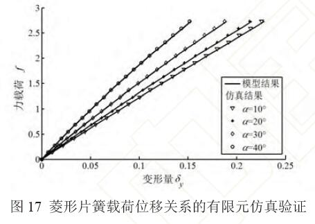 菱形片簧載荷位移關(guān)系的模型結(jié)果和仿真結(jié)果 對比如圖17 所示(量綱一化)。對四種不同傾斜角的 菱形片簧,模型與有限元仿真的結(jié)果相對誤差不超 過1.5%,式(24)模型的有效性和準(zhǔn)確性得到驗證。