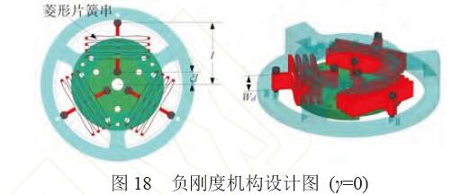 (2) 通過匹配正負(fù)剛度,得到曲柄彈簧機(jī)構(gòu)中 的彈簧的剛度特性(式(16)),建立模型(式(19))分析 了曲柄彈簧機(jī)構(gòu)結(jié)構(gòu)參數(shù)對零剛度柔性鉸鏈零剛度 品質(zhì)的影響,理論上,在內(nèi)外環(huán)柔性鉸鏈的可用行 程內(nèi)(±20°),剛度平均降低幅度可達(dá)97%。