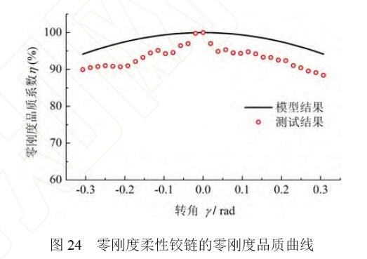 利用測試平臺對內(nèi)外環(huán)柔性鉸鏈和零剛度柔性鉸鏈的轉(zhuǎn)動剛度進(jìn)行測試,測試結(jié)果如圖23 所示。 根據(jù)式(19)計算并繪制零剛度柔性鉸鏈的零剛度品 質(zhì)曲線,如圖24 所示。