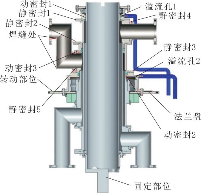 隨著雷達技術(shù)體制的不斷更新和發(fā)展, 雷達逐漸向大陣面、大數(shù)據(jù)發(fā)展, 因而對雷達傳輸功率的要求越來越高, 傳統(tǒng)的風冷已滿足不了大型雷達的冷卻要求, 需采用液冷對雷達陣面進行冷卻?,F(xiàn)代地面雷達雖然逐漸開始采用相位掃描代替?zhèn)鹘y(tǒng)的機械掃描工作方式, 但仍有機械方位轉(zhuǎn)動的要求[1-3]。在雷達工作過程中, 地面設(shè)備與天線陣面設(shè)備之間冷卻液的轉(zhuǎn)動傳輸就需要靠液體旋轉(zhuǎn)關(guān)節(jié) (又稱水鉸鏈) 來實現(xiàn)[4-5]。水鉸鏈的性能穩(wěn)定與否, 關(guān)系著雷達冷卻系統(tǒng)的整體性能[6]。因此保證水鉸鏈的壽命和可靠性至關(guān)重要。