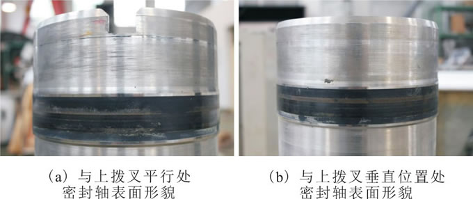 c.解剖發(fā)現(xiàn), 離該水鉸鏈與匯流環(huán)連接處最近的動密封1磨損最嚴重, 離該連接處較遠的動密封2和動密封3僅有少許磨損 (如圖3所示) , 因此動密封1對應(yīng)的密封軸磨損也最嚴重 (如圖5所示) 。