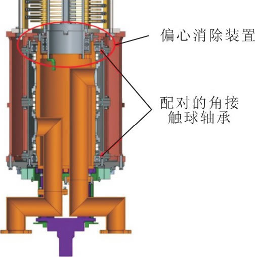 a.將水鉸鏈的結(jié)構(gòu)形式由徑向排布式改進為軸向排布式, 縮短水鉸鏈的軸向尺寸[5], 從而在保證原外形接口與尺寸不變的情況下, 在水鉸鏈與匯流環(huán)中間增加偏心消除裝置 (如圖8所示) 。