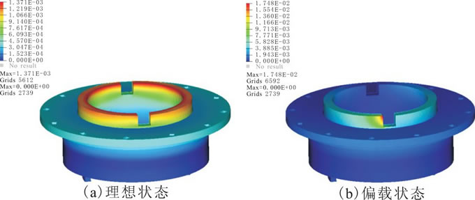 為此, 對水鉸鏈建有限元模型, 分別對其在理想狀態(tài)下 (僅受到匯流環(huán)帶來的100N·m扭矩作用) 與偏載狀態(tài)下 (受到匯流環(huán)帶來的100N·m扭矩和0.4°偏擺角的共同作用) 進行力學仿真分析, 分析結(jié)果如圖6所示。
