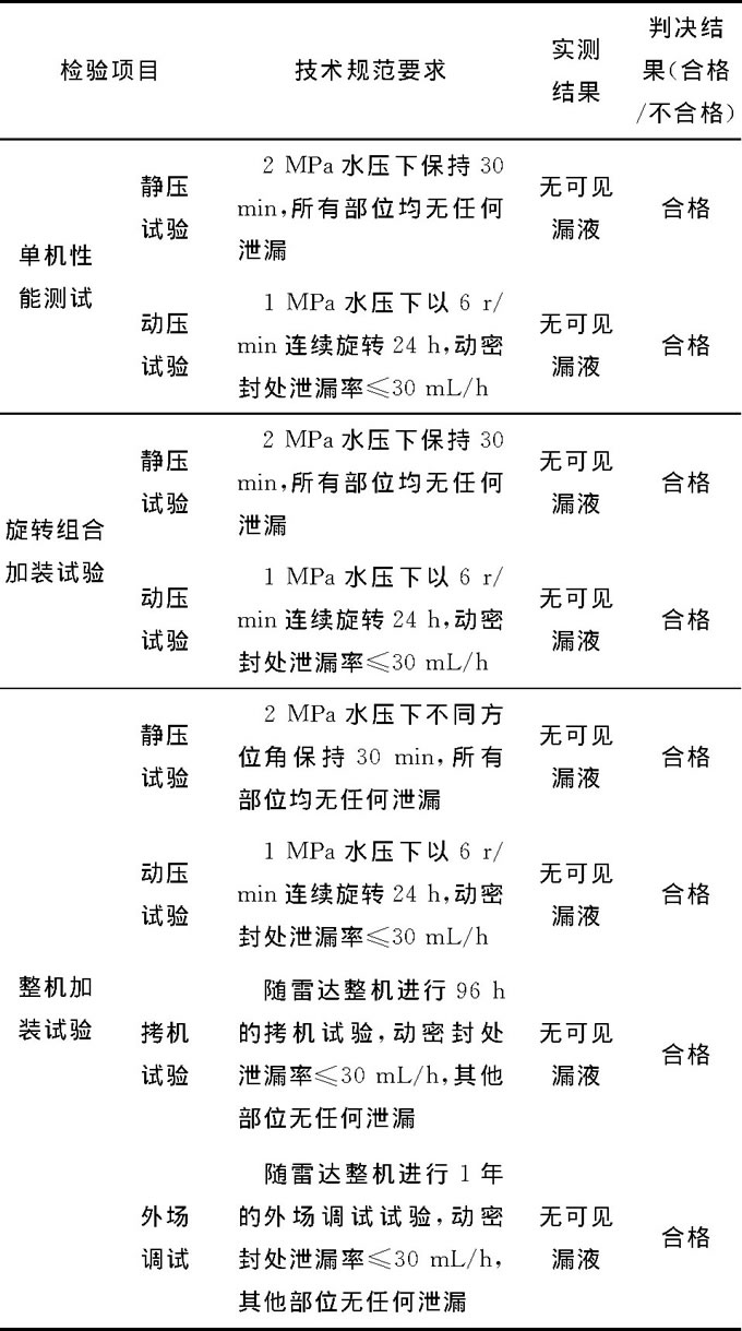 經(jīng)過改進后的水鉸鏈已通過單機性能測試試驗、與匯流環(huán)集成旋轉(zhuǎn)組合后的壓力測試試驗, 以及整機加裝試驗, 并已隨雷達整機進行96h拷機試驗及1年的隨雷達整機外場調(diào)試試驗, 試驗情況和試驗結(jié)果如表1所示。結(jié)果表明, 改進水鉸鏈各項性能表現(xiàn)良好, 無任何故障出現(xiàn)。