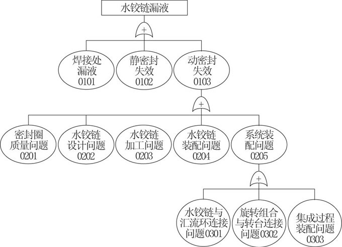 為了對漏液故障準確定位, 結(jié)合水鉸鏈的內(nèi)部結(jié)構(gòu) (圖1) , 建立故障樹 (圖2) , 并按此逐層分析。