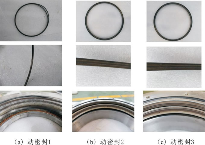 c.解剖發(fā)現(xiàn) (如圖3所示) , 動密封1 (最上端動密封圈) 齒形滑環(huán)的齒形已磨損嚴重, 其中起補償作用的O型圈已出現(xiàn)不可恢復的變形, 而動密封2 (最下端動密封圈) 和動密封3 (通道之間的動密封圈) 齒形滑環(huán)的齒形只有少許磨損。