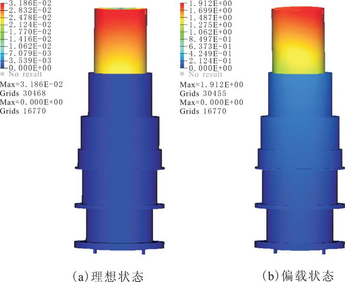 由力學仿真分析可知, 水鉸鏈在理想狀態(tài)下, 內(nèi)軸上端的最大變形量為0.032 mm;在偏載狀態(tài)下, 離該水鉸鏈與匯流環(huán)內(nèi)軸連接部位越近變形量越大, 并且水鉸鏈內(nèi)軸最頂端與撥叉方向垂直的部位變形量最大, 最大變形量為1.91mm。